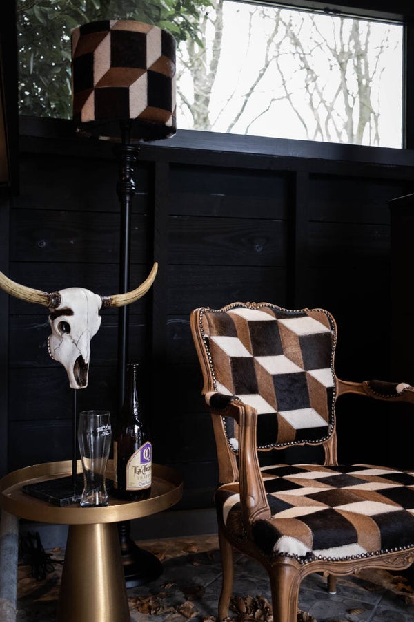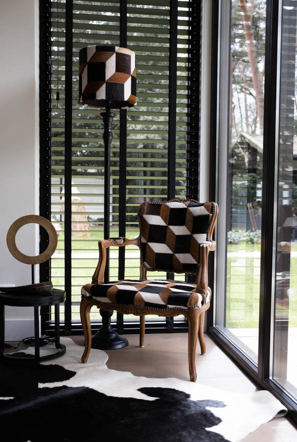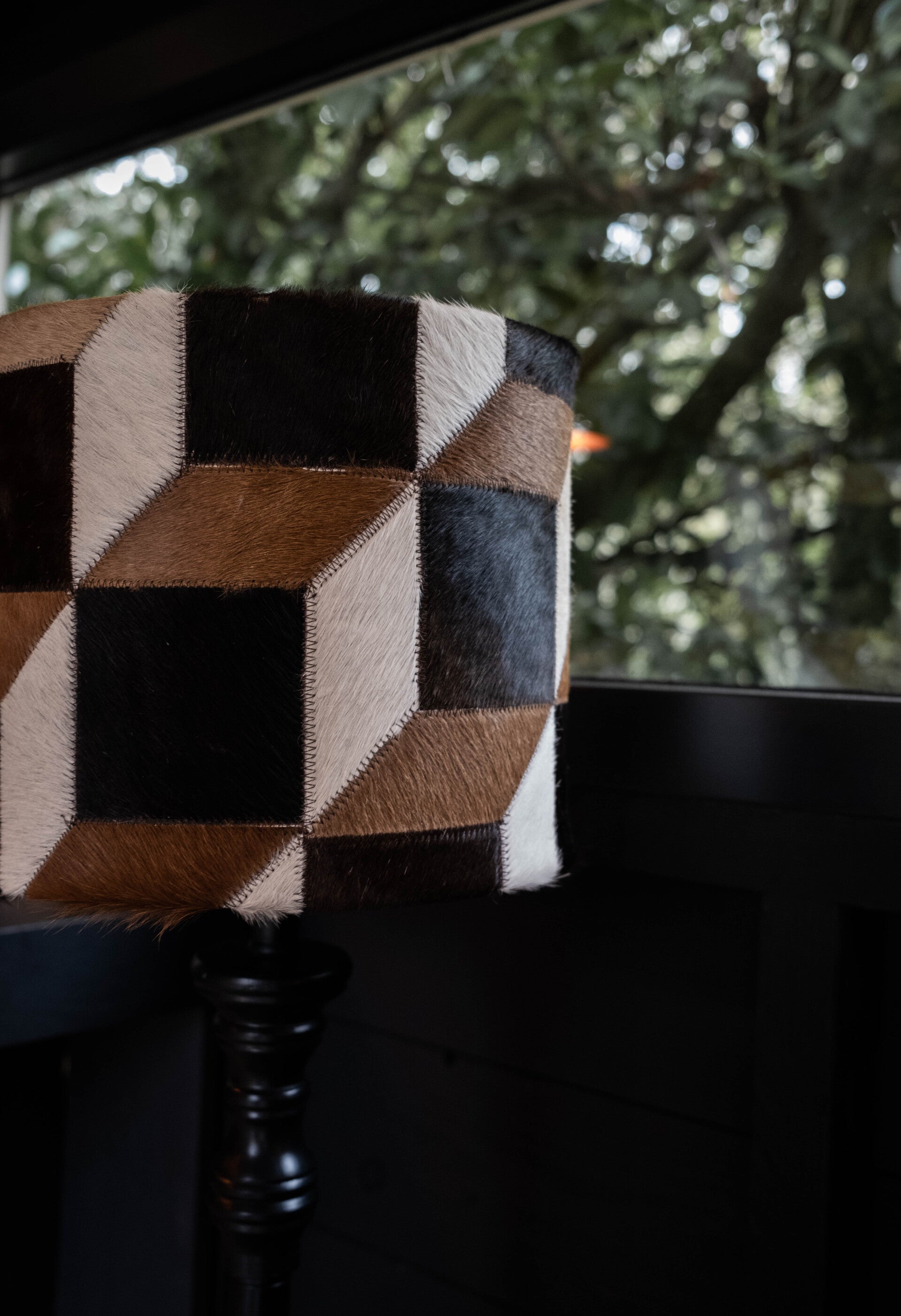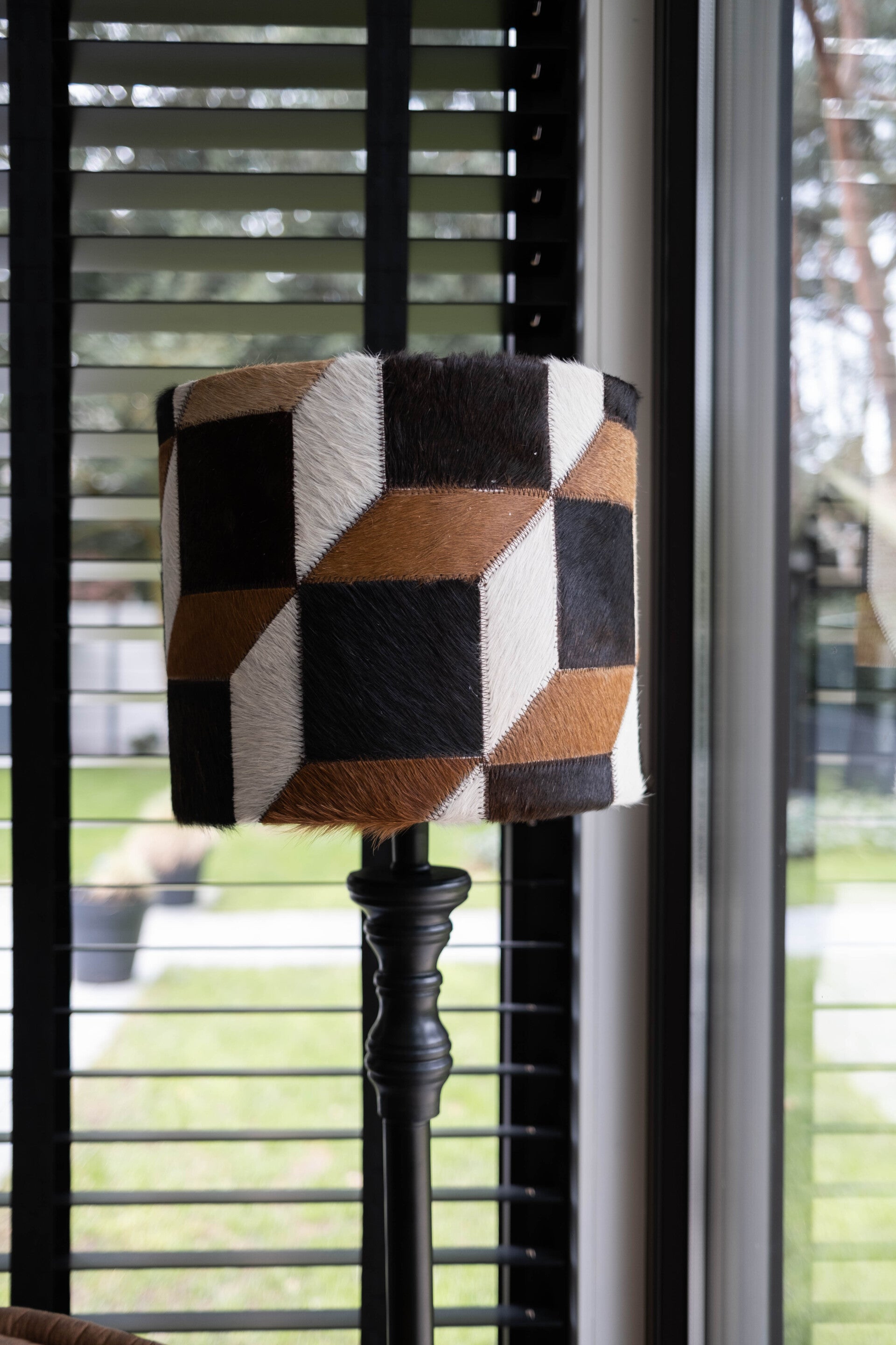 Deze unieke lampenkap is een ware blikvanger in elk interieur. Het patchwork van echt koeienhuid geeft de kap een luxe uitstraling en zorgt voor een warme, sfeervolle gloed. Elke lampenkap is met zorg en vakmanschap zelf gemaakt in ons atelier, Geen lampenkap is hetzelfde, waardoor je een exclusief en uniek product in huis haalt.