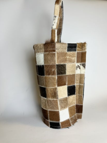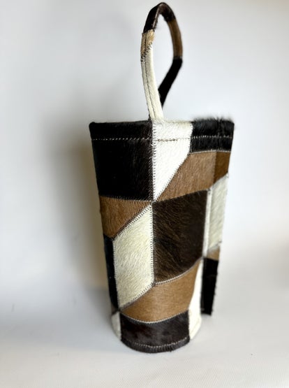 Breng stijl en functionaliteit samen met deze exclusieve patchwork wijnkoeler van echte koeienhuid. Elk exemplaar is handgemaakt en daardoor volledig uniek in kleur en patroon. De natuurlijke textuur van de koeienhuid geeft een robuuste, luxe uitstraling die perfect past in zowel een landelijk als modern interieur.